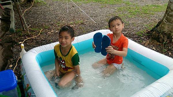 隔壁水泥區帶了充氣泳池,孩子們很興奮去問可不可以一起玩,結果買上借了一個小的回來!